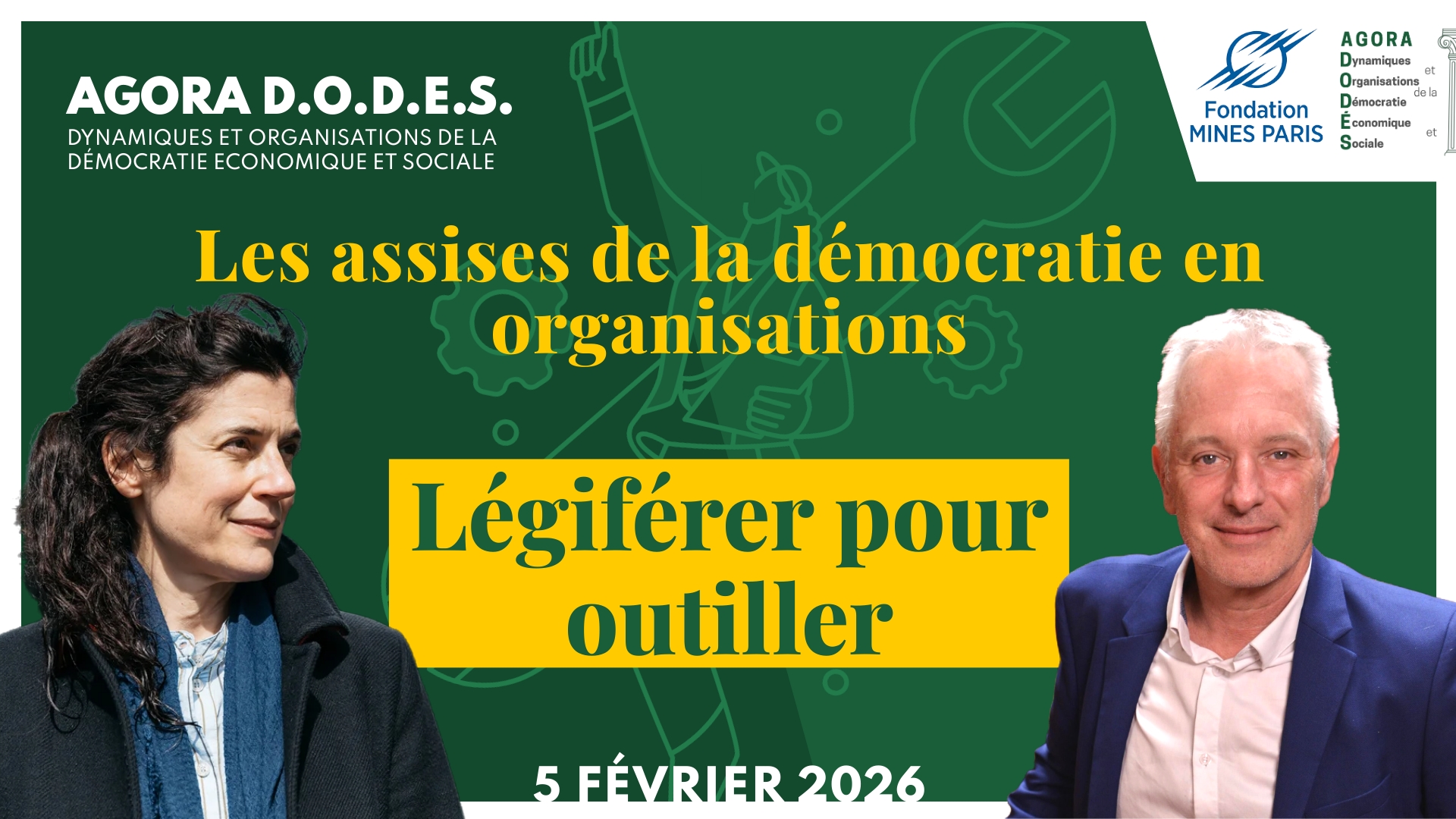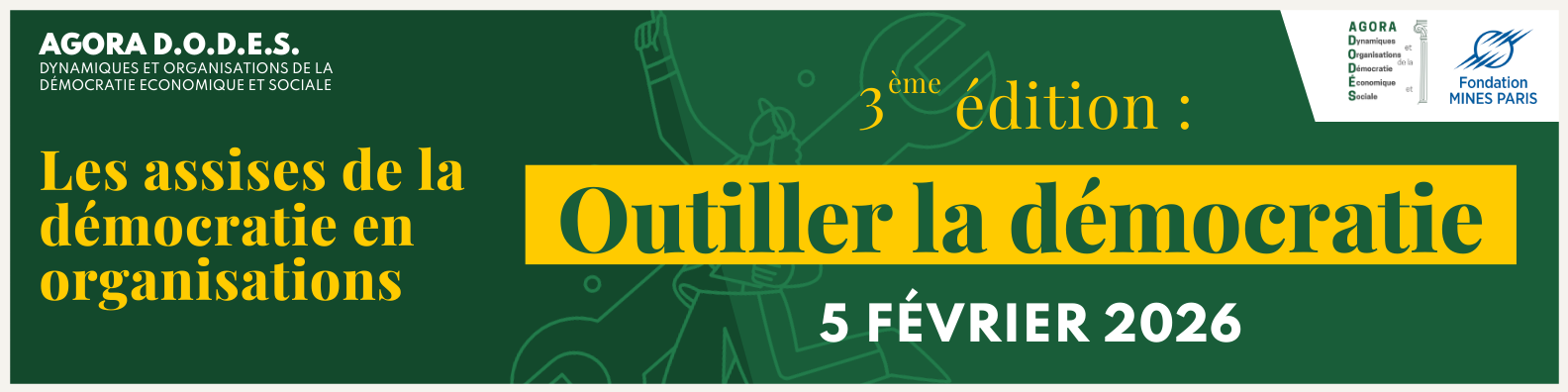 L'Agora D.O.D.E.S. est un laboratoire d'idées réunissant une communauté de praticien.ne.s et chercheur.se.s engagés dans la transformation des organisations vers une démocratie économique et sociale. Fondée en 2023 à l'École des Mines de Paris, notre communauté tire son inspiration de la devise de l'école, "Théorie et Pratique", fusionnant ainsi la rigueur académique et une approche pragmatique.