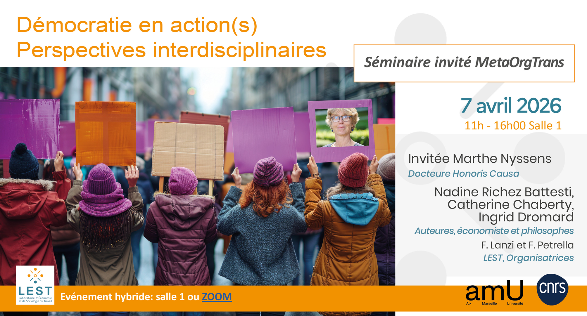 À l’occasion de la remise du titre de Docteure Honoris Causa 2026 d’Aix-Marseille Université à Marthe Nyssens, le LEST et le projet Meta-Org Trans organisent un séminaire intitulé « Démocratie en action(s) – Perspectives interdisciplinaires », consacré aux formes contemporaines de la démocratie dans les organisations de l’économie sociale et solidaire (ESS) et les communs.